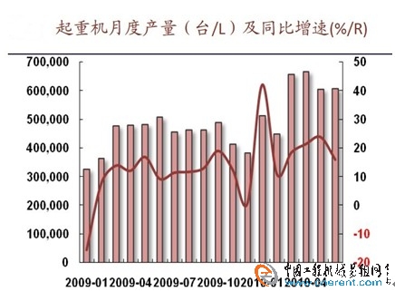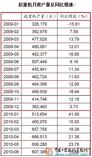 2010年4月份起重機產量為666513臺,同比增長21.36%;5月份起重機產量為606280臺,同比增長23.76%;6月份產量為607389臺,同比增長15.88%。至2010年6月,起重機市場已經持續(xù)17個月同比正增長。2010年的2-5月,連續(xù)4月增幅逐步擴大;6月同比增速略有降低。